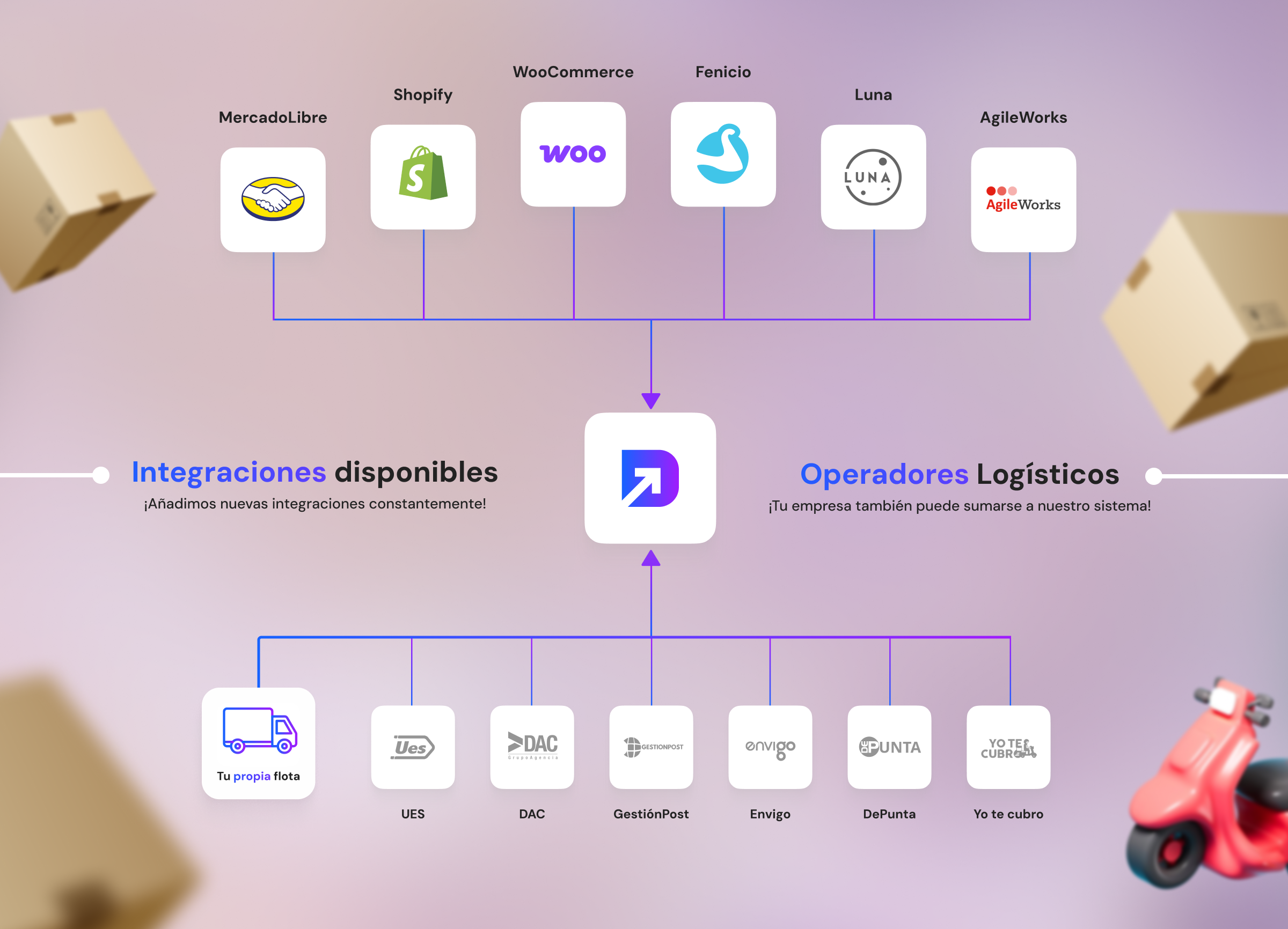- Integraciones nativas con las principales plataformas de ecommerce: MercadoLibre, Shopify, WooCommerce, Fenicio, Luna y AgileWork.