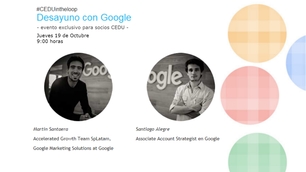 La actividad se llevará a cabo el jueves 19 de octubre a las 9:00 horas en Sinergia Design.Con el objetivo de continuar apoyando el crecimiento del comercio digital en el país, CEDU, realizará una capacitación con el gigante de internet, Google.Este encuentro, el tercero de un ciclo iniciado en agosto, tendrá lugar el jueves 19 de octubre a las 9:00 horas en Sinergia Design (no poner dirección, igual no era la que habían puesto).El workshop será dictado por Martín Santaera y Santiago Alegre, ambos Associate Account Strategist y parte del Accelerated Growth Team de Google Argentina.La capacitación tendrá como protagonista a Google Analytics, la herramienta de analítica web más utilizada, y los expositores presentarán tips para aprovecharla al máximo, haciendo un mix con estrategias de marketing digital aplicables al eCommerce para potenciar las ventasEl evento es exclusivo para socios de CEDU. Por más información: contacto@cedu.org.uyPara inscribirse: FORMULARIO